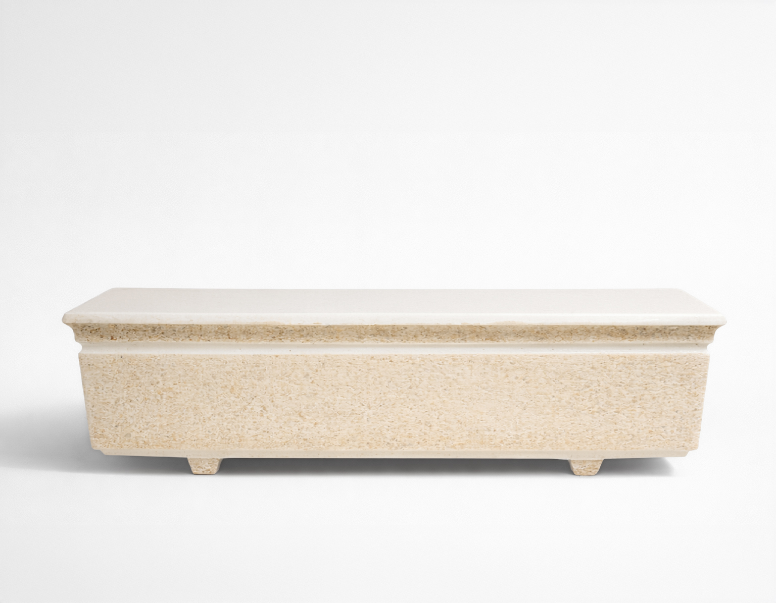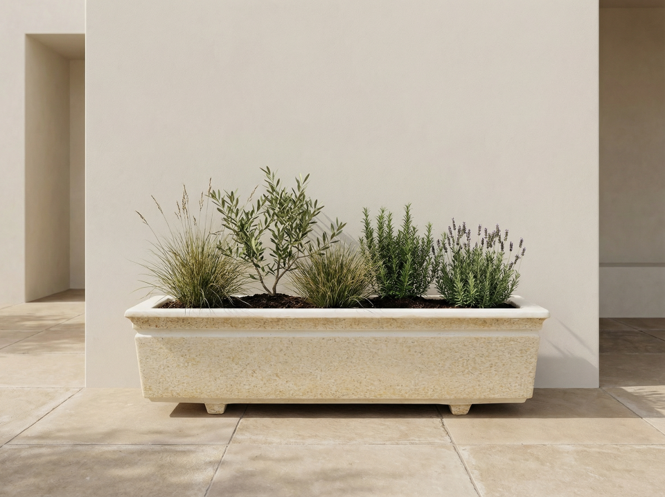 Peça produzida em cimento branco com agregados minerais aparentes, que valoriza a textura natural do material e confere carácter a qualquer espaço exterior.