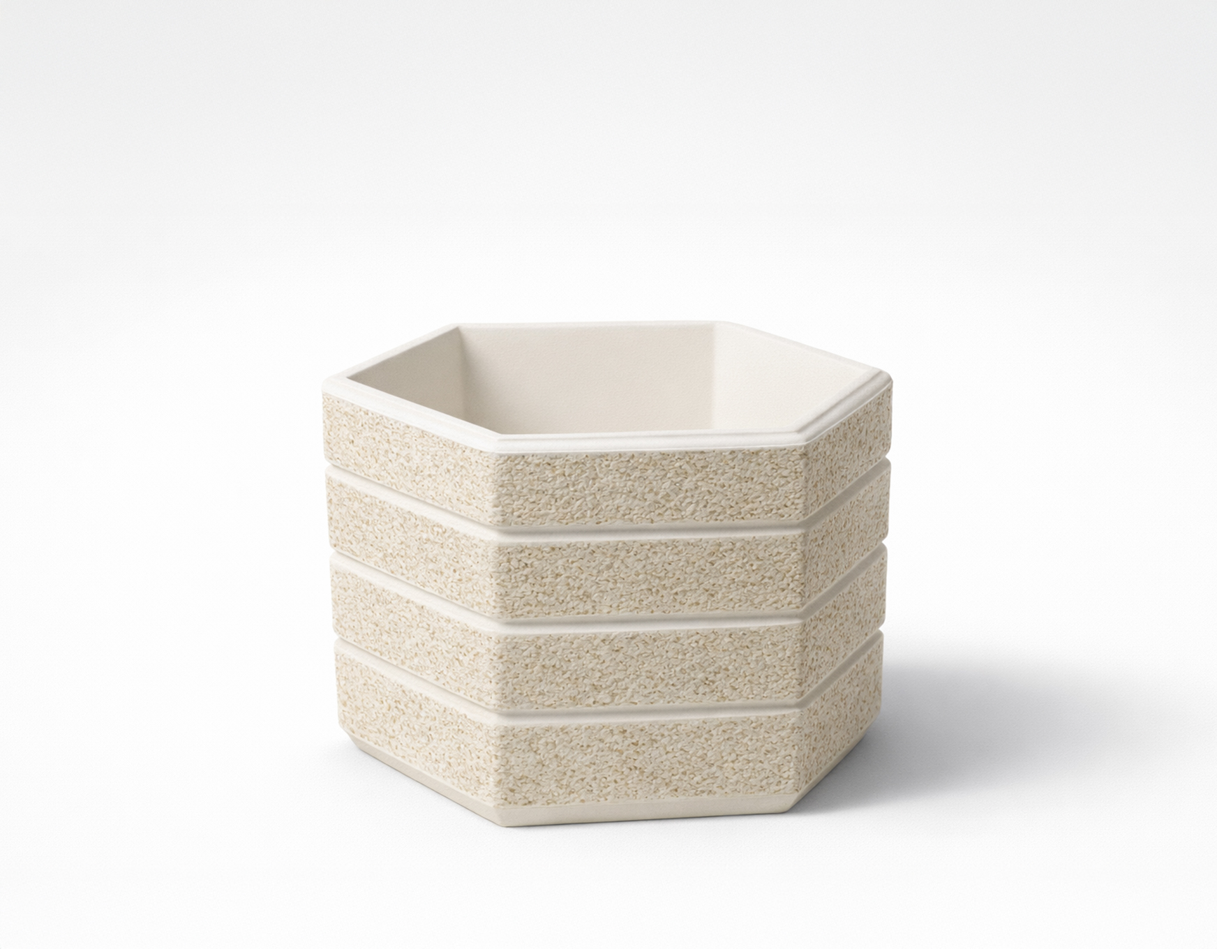 Peça produzida em cimento branco com agregados minerais aparentes, que valoriza a textura natural do material e confere carácter a qualquer espaço exterior.